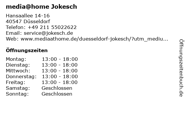 | Öffnungszeiten media@home Jokesch in Düsseldorf anzeigen | |