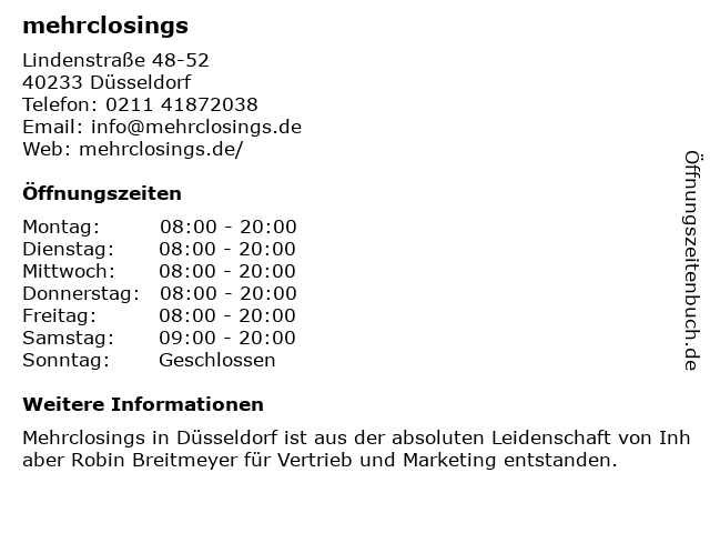 | Öffnungszeiten mehrclosings in Düsseldorf anzeigen | |