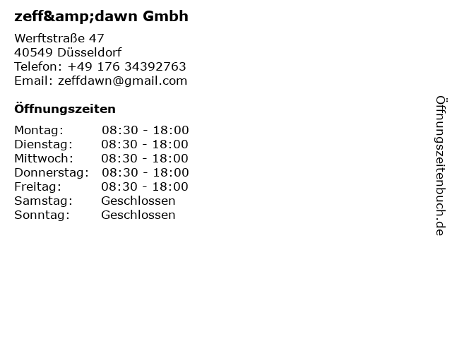 | Öffnungszeiten zeff&dawn Gmbh in Düsseldorf anzeigen | |
