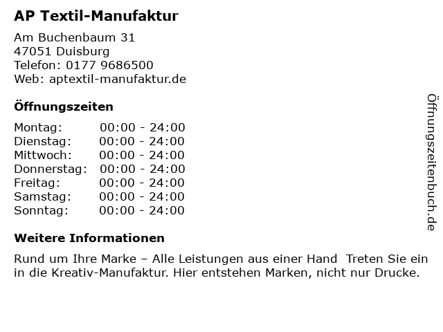 | Öffnungszeiten AP Textil-Manufaktur in Duisburg anzeigen | |