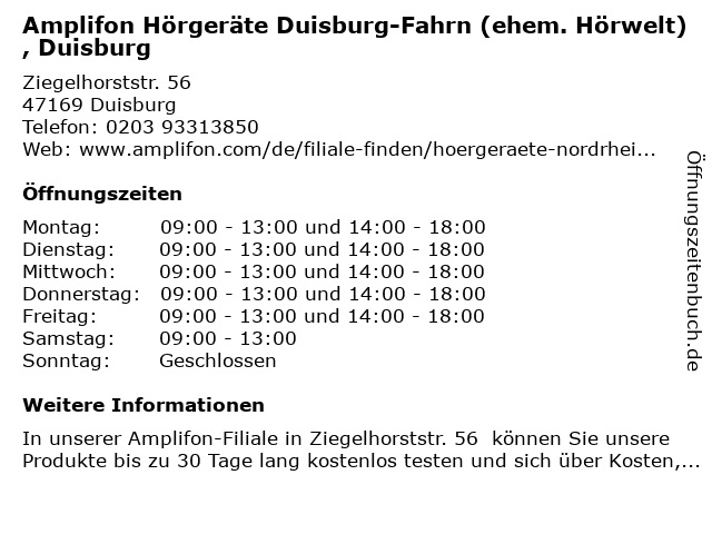 Branchen & Suchbegriffe zu Amplifon Hörgeräte Duisburg-Fahrn (ehem. Hörwelt), Duisburg:amplifon, audiologie, ehem., fahrn, hörgeräte, hörwelt |