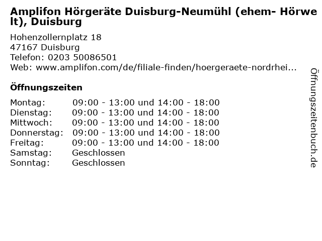 Branchen & Suchbegriffe zu Amplifon Hörgeräte Duisburg-Neumühl (ehem- Hörwelt), Duisburg:amplifon, audiologie, berater für av, ehem, hals-nasen-ohren-heilkunde, hersteller, hörgeräte, hörwelt, kliniken, kurkliniken, neumühl |