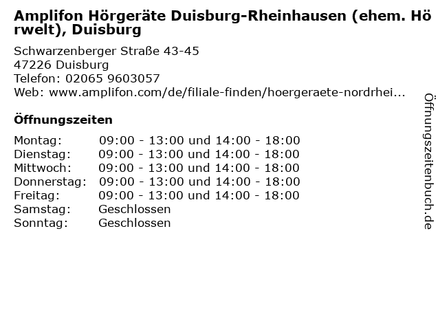 Branchen & Suchbegriffe zu Amplifon Hörgeräte Duisburg-Rheinhausen (ehem. Hörwelt), Duisburg:amplifon, audiologie, berater für av, ehem., hals-nasen-ohren-heilkunde, hersteller, hörgeräte, hörwelt, kliniken, kurkliniken, rheinhausen |