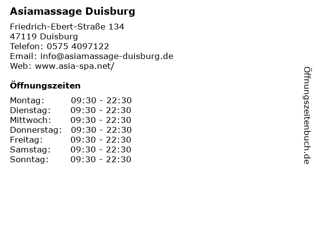 | Öffnungszeiten Asiamassage Duisburg in Duisburg anzeigen | |