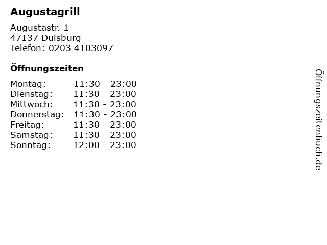 | Öffnungszeiten Augustagrill in Duisburg anzeigen | |