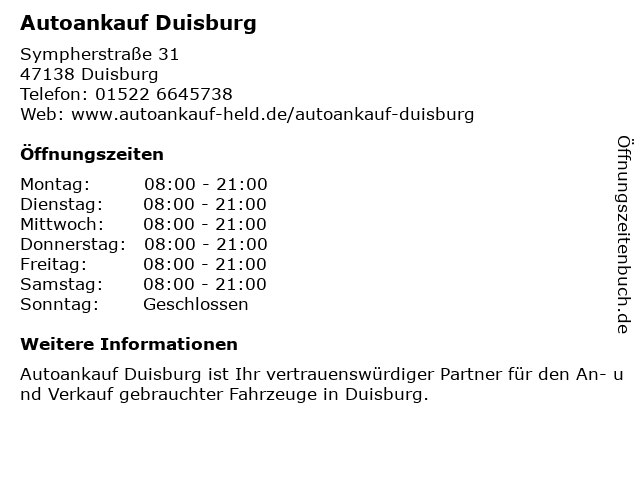 | Öffnungszeiten Autoankauf Duisburg in Duisburg anzeigen | |