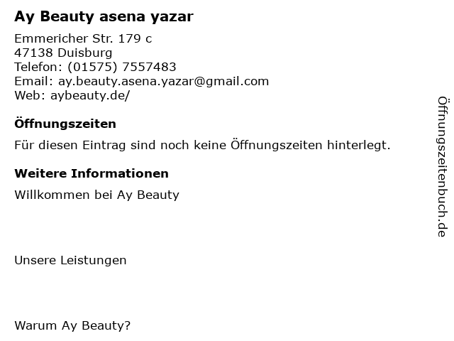 | Öffnungszeiten Ay Beauty asena yazar in Duisburg anzeigen | |