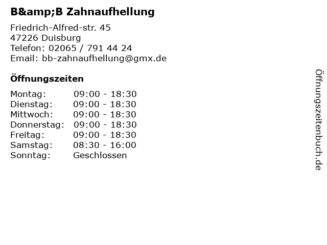 | Öffnungszeiten B&B Zahnaufhellung in Duisburg anzeigen | |