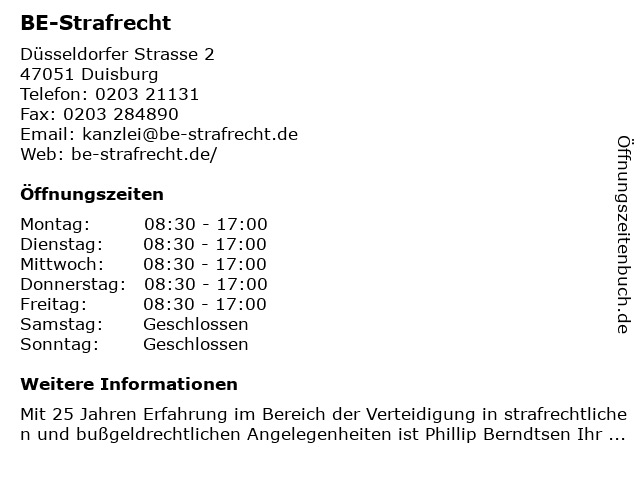 | Öffnungszeiten BE-Strafrecht in Duisburg anzeigen | |
