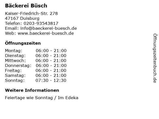 | Öffnungszeiten Bäckerei Büsch in Duisburg anzeigen | |