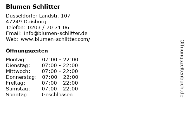 | Öffnungszeiten Blumen Schlitter in Duisburg anzeigen | |
