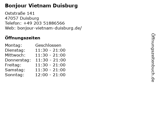 | Öffnungszeiten Bonjour Vietnam Duisburg in Duisburg anzeigen | |