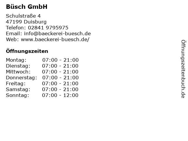 | Öffnungszeiten Büsch GmbH in Duisburg anzeigen | |