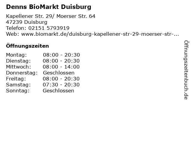 | Öffnungszeiten Denns BioMarkt Duisburg in Duisburg anzeigen | |