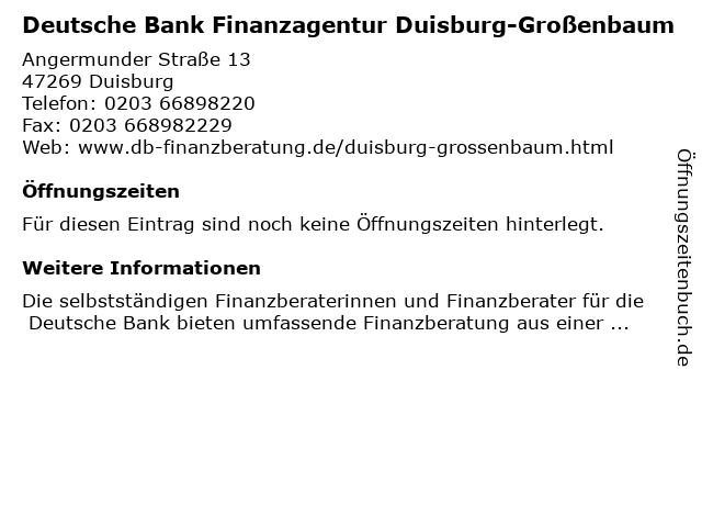 | Deutsche Bank Finanzagentur Duisburg-Großenbaum anrufen | |
