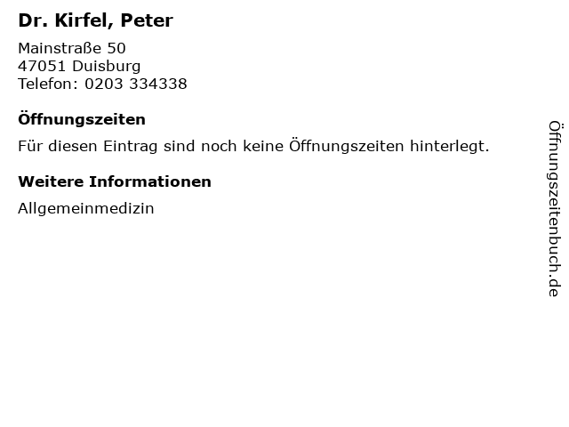 | Öffnungszeiten Dr. Kirfel, Peter in Duisburg anzeigen | |