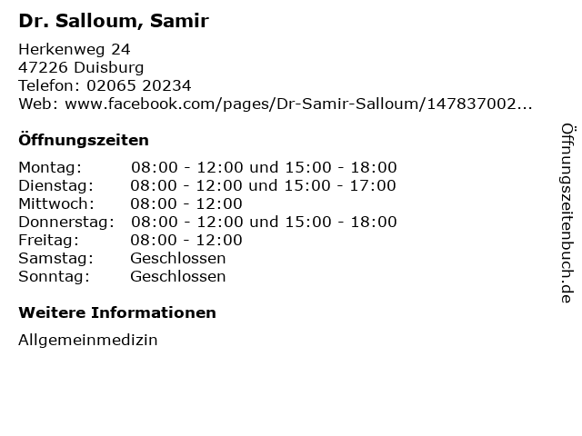 | Öffnungszeiten Dr. Salloum, Samir in Duisburg anzeigen | |