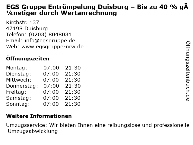 Branchen & Suchbegriffe zu EGS Gruppe Entrümpelung Duisburg – Bis zu 40 % günstiger durch Wertanrechnung:40, bis, durch, egs, entrümpelung, gruppe, günstiger, wertanrechnung, zu, – |