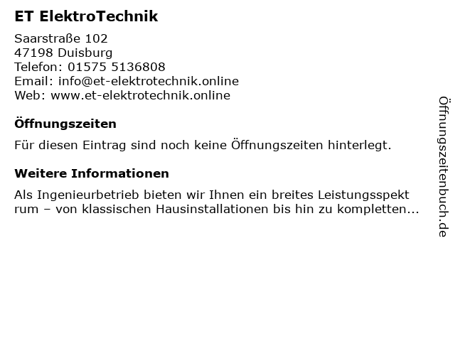 | Öffnungszeiten ET ElektroTechnik in Duisburg anzeigen | |