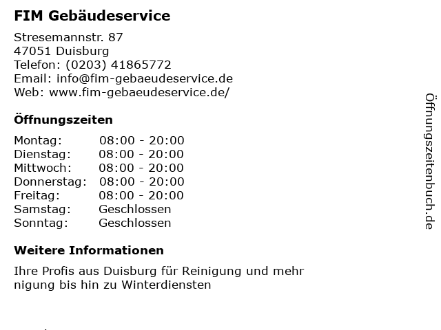 | Öffnungszeiten FIM Gebäudeservice in Duisburg anzeigen | |