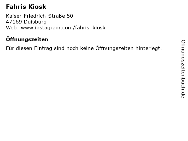 | Öffnungszeiten Fahris Kiosk in Duisburg anzeigen | |