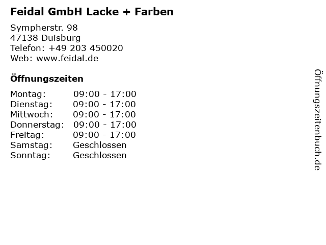 | Öffnungszeiten Feidal GmbH Lacke + Farben in Duisburg anzeigen | |