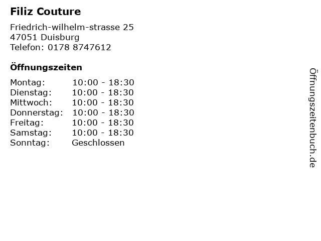 | Öffnungszeiten Filiz Couture in Duisburg anzeigen | |