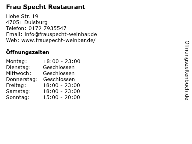 | Öffnungszeiten Frau Specht Restaurant in Duisburg anzeigen | |
