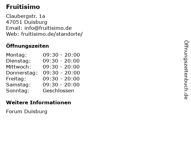 | Öffnungszeiten Fruitisimo in Duisburg anzeigen | |