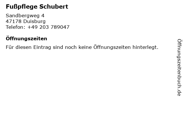 | Öffnungszeiten Fußpflege Schubert in Duisburg anzeigen | |