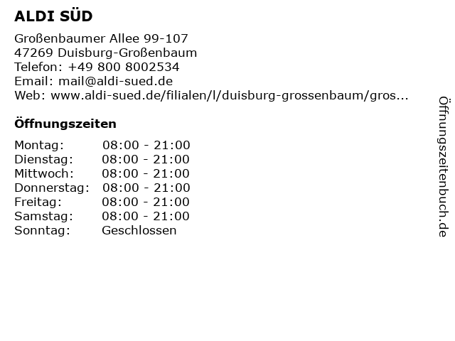 | Öffnungszeiten ALDI SÜD in Duisburg-Großenbaum anzeigen | |