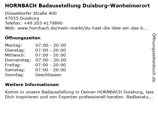 1 HORNBACH Gartencenter Duisburg-Wanheimerort (Entfernung: 0,00 km) Düsseldorfer Straße 400, 47055 Duisburg 5 badpunkt Badausstellung Krefeld - Zimmer & Kellermann (Entfernung: 15,86 km) Ritterstraße 5, 47805 Krefeld 6 |