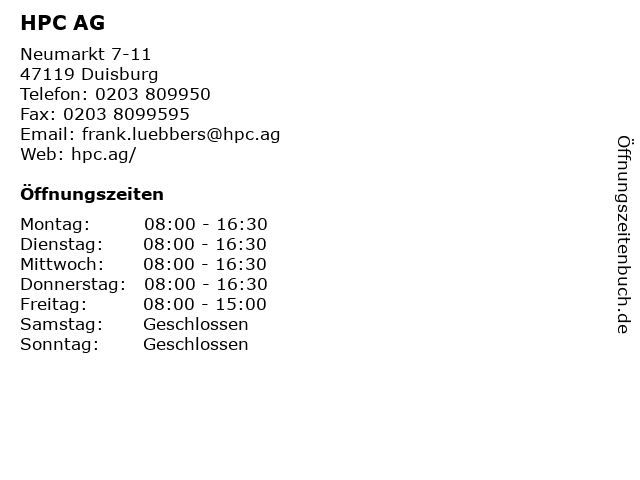| Öffnungszeiten HPC AG in Duisburg anzeigen | |