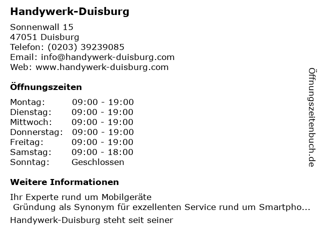 | Öffnungszeiten Handywerk-Duisburg in Duisburg anzeigen | |