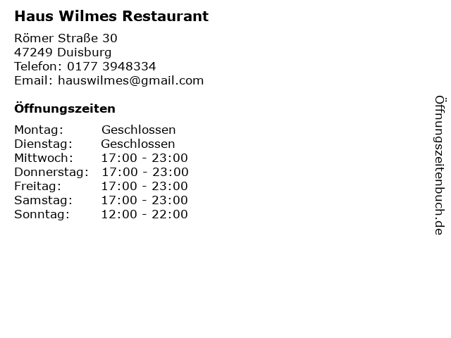 | Öffnungszeiten Haus Wilmes Restaurant in Duisburg anzeigen | |
