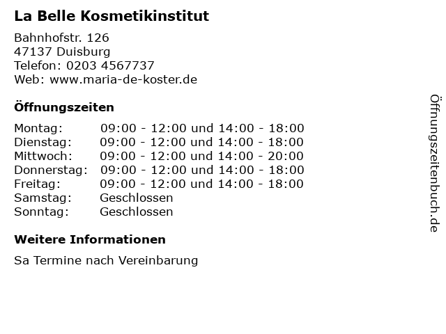 | Öffnungszeiten La Belle Kosmetikinstitut in Duisburg anzeigen | |