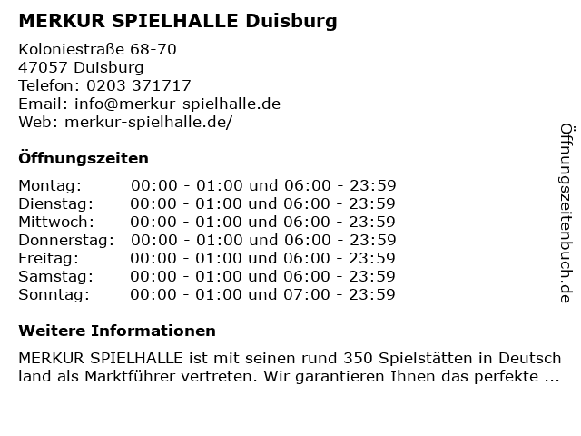 | Öffnungszeiten MERKUR SPIELHALLE Duisburg in Duisburg anzeigen | |