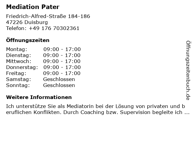 | Öffnungszeiten Mediation Pater in Duisburg anzeigen | |