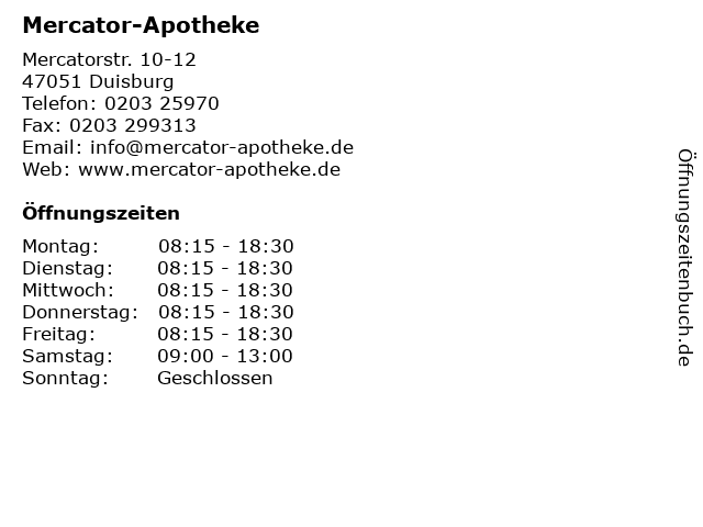 | Öffnungszeiten Mercator-Apotheke in Duisburg anzeigen | |
