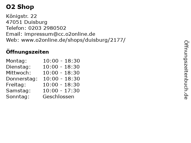 | Öffnungszeiten O2 Shop in Duisburg anzeigen | |