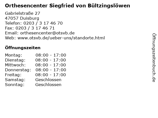 4 Sanitätshaus Siegfried von Bültzingslöwen (Entfernung: 5,20 km) Friedrich-Alfred-Str. 60, 47226 Duisburg 5 6 Sanitätshaus Siegfried von Bültzingslöwen (Entfernung: 6,55 km) Lothringer Str. 116, 46045 Oberhausen |