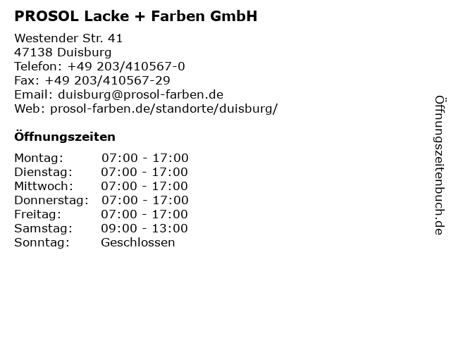 | Öffnungszeiten PROSOL Lacke + Farben GmbH in Duisburg anzeigen | |