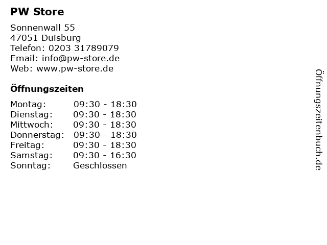 | Öffnungszeiten PW Store in Duisburg anzeigen | |