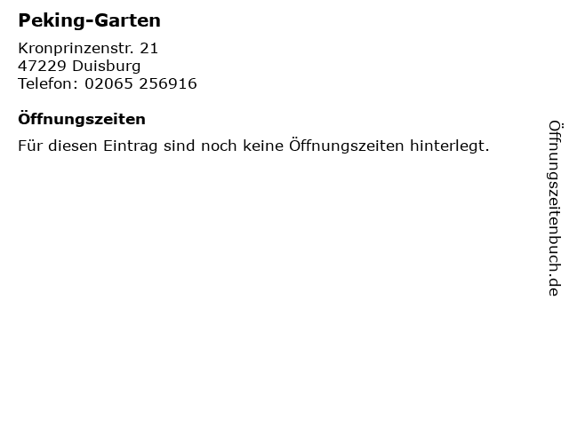 | Öffnungszeiten Peking-Garten in Duisburg anzeigen | |