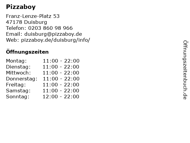 | Öffnungszeiten Pizzaboy in Duisburg anzeigen | |
