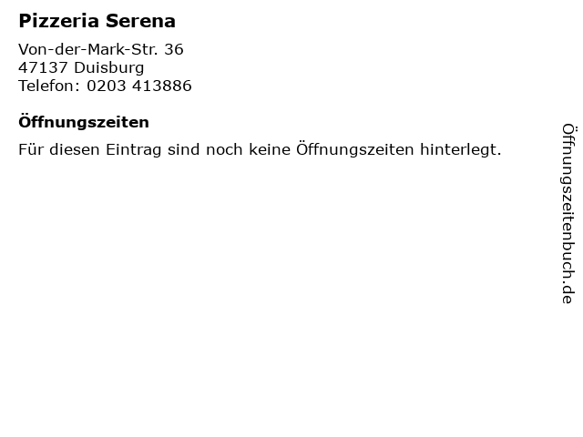 | Öffnungszeiten Pizzeria Serena in Duisburg anzeigen | |