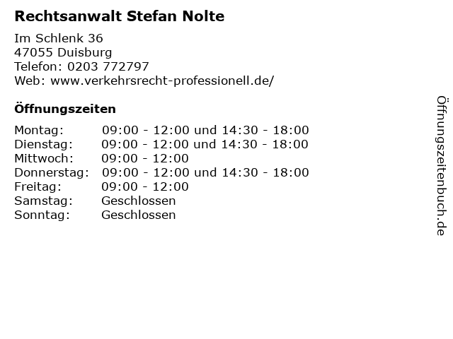 | Öffnungszeiten Rechtsanwalt Stefan Nolte in Duisburg anzeigen | |
