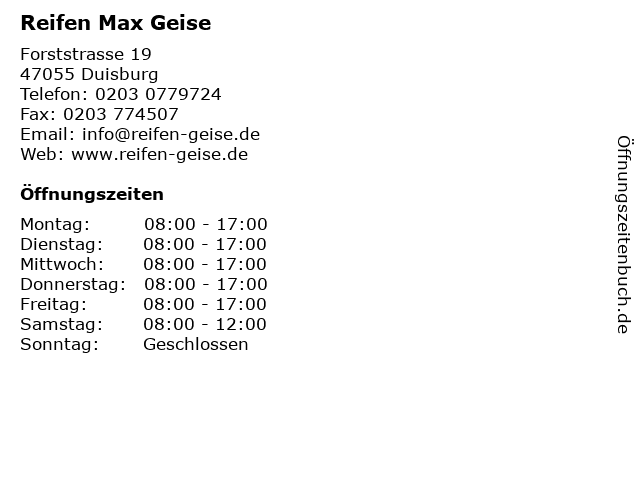 | Öffnungszeiten Reifen Max Geise in Duisburg anzeigen | |