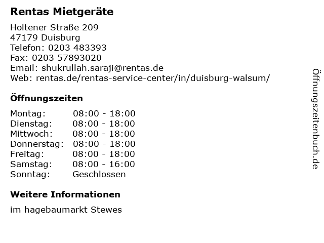 | Öffnungszeiten Rentas Mietgeräte in Duisburg anzeigen | |