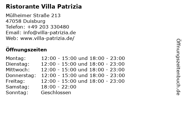 | Öffnungszeiten Ristorante Villa Patrizia in Duisburg anzeigen | |